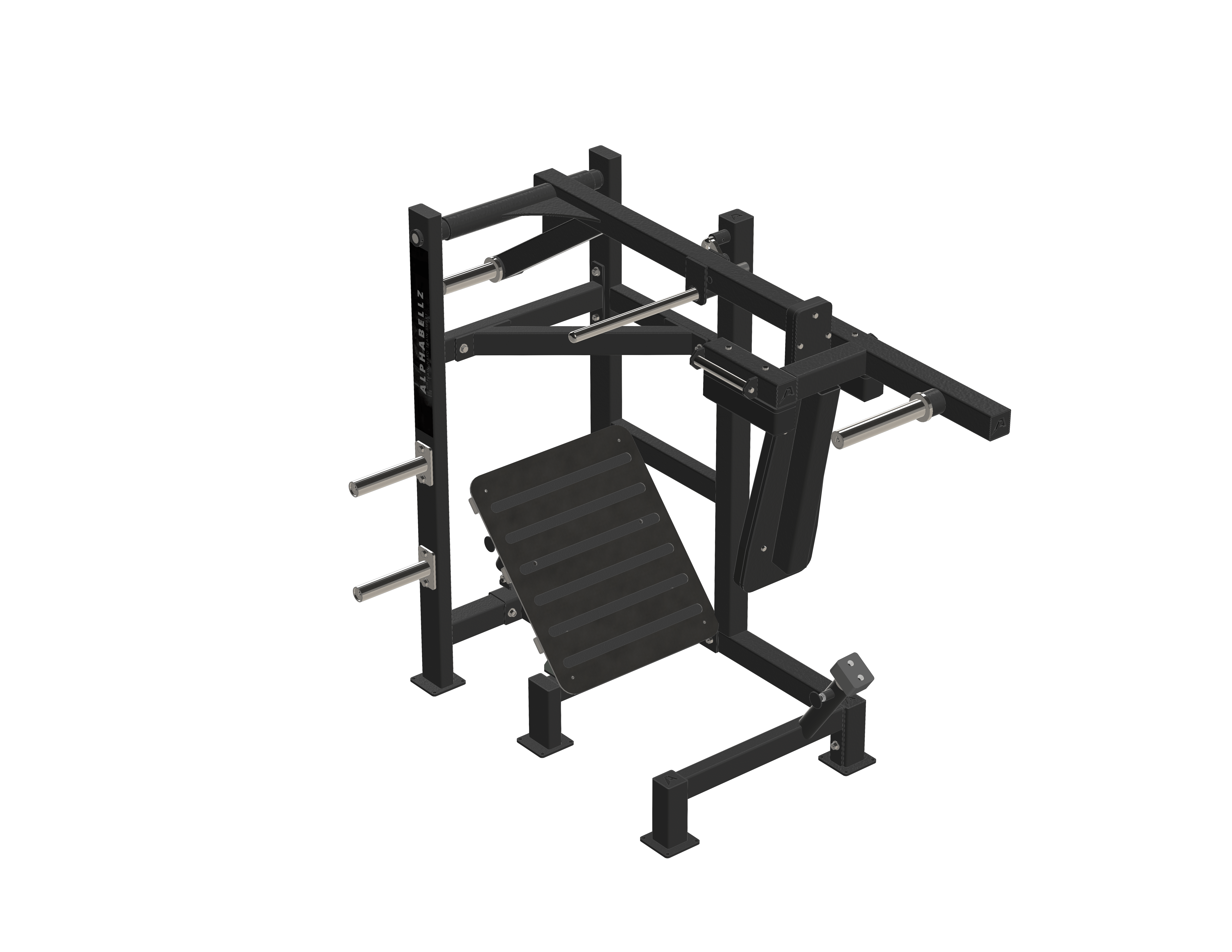 The Alphabellz plate loaded Pendulum Squat is one of the most popular Alphabellz pieces of equipment. This Pendulum Squat has a large range of motion, a large back pad to secure body placement and includes 11 gauge uprights for unit stability.